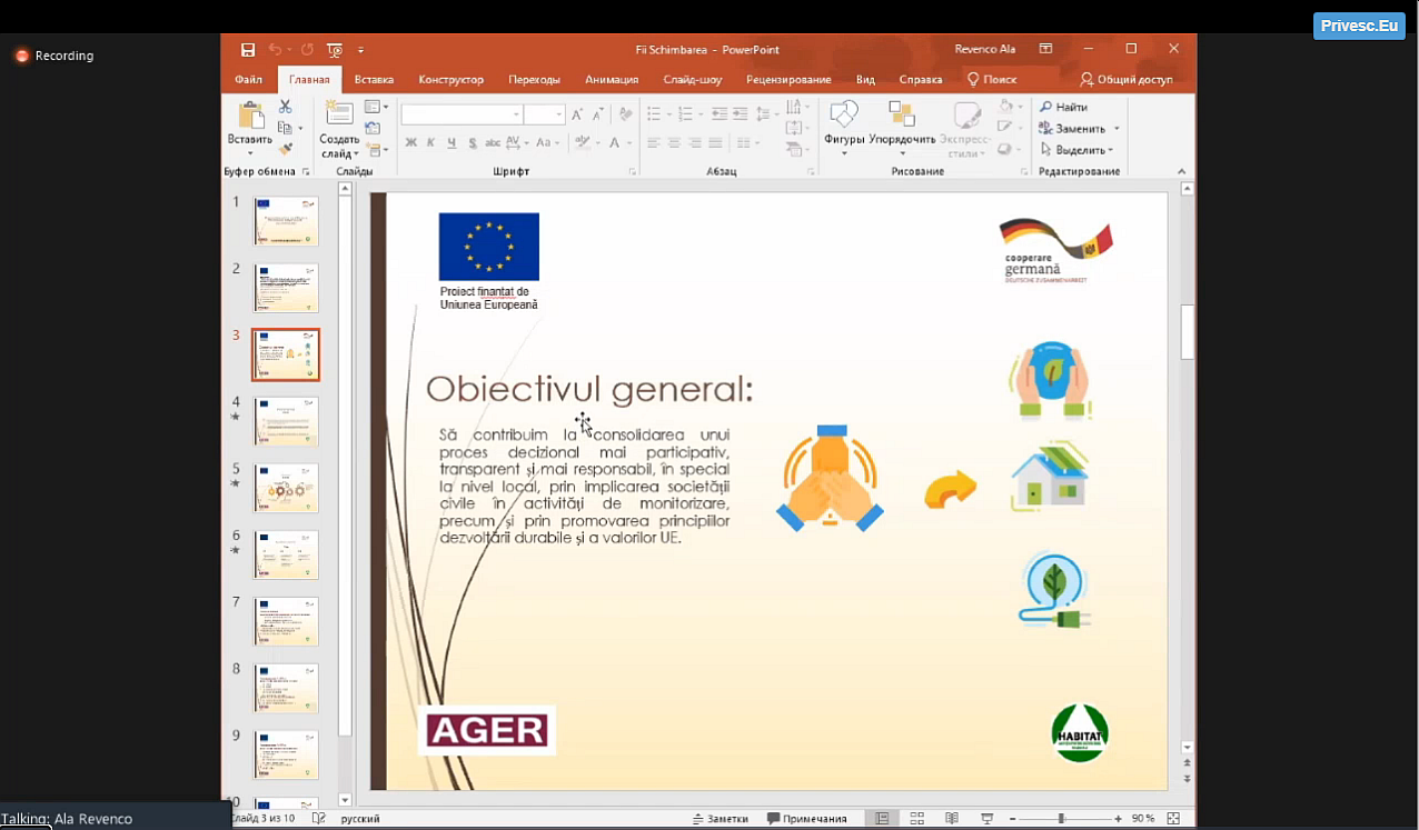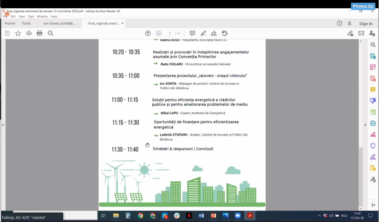 Timp de 2 ore s-a discutat despre cum putem dezvolta orașul Ialoveni astfel încât să devină un oraș prietenos cu locuitorii acestuia, punând accent pe încurajarea eficienței energetice și reducerea poluării. Evenimentul a fost deschis de doamna Ala Revenco – director executiv al Asociației pentru Guvernare Eficientă și Responsabilă și domnul Valeriu Rusu – președinte al AO „HABITAT”.